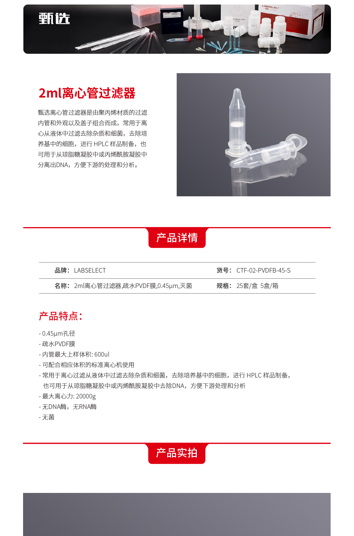 2ml离心管过滤器,疏水PVDF膜,0.45μm,灭菌